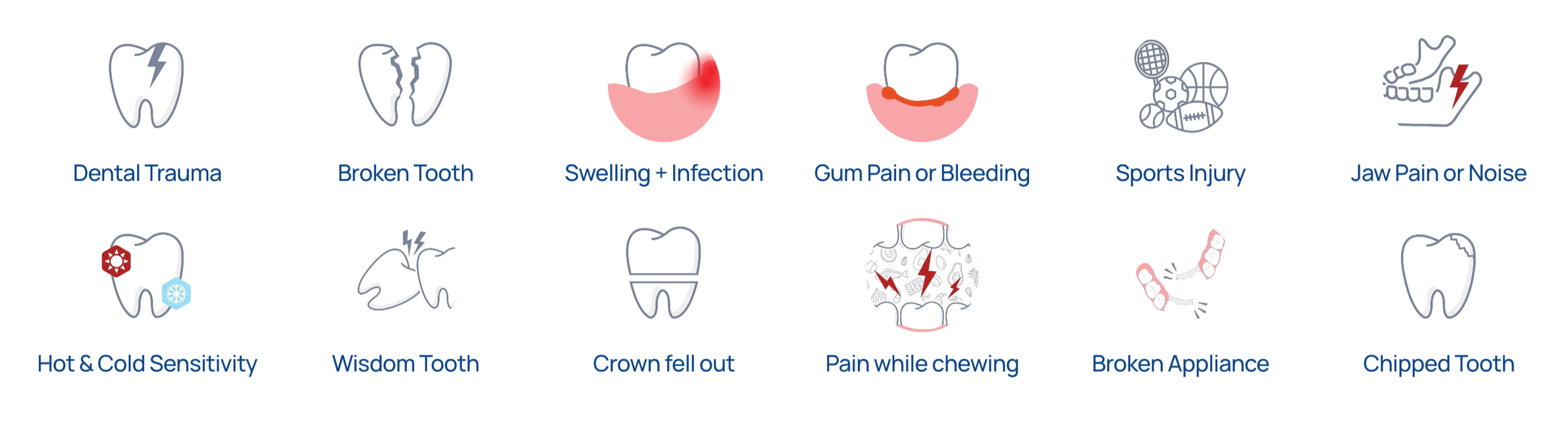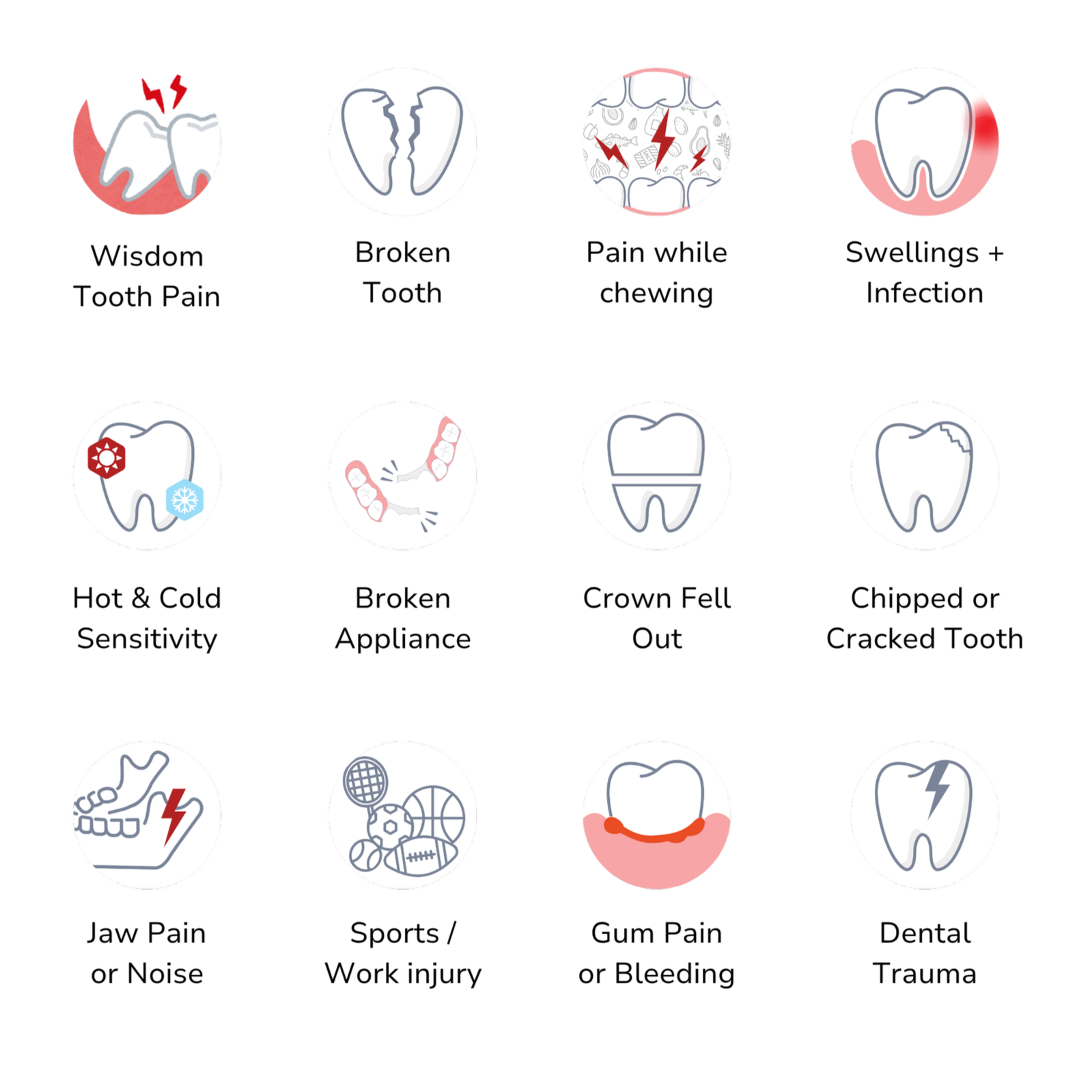 We treat a broad range of dental emergencies, including severe toothaches, infections, swelling, broken teeth, cracked teeth, knocked-out teeth, lost crowns or fillings, abscesses, and wisdom tooth pain. If your dental problem is causing pain, discomfort, or concern, our office is here to help.
